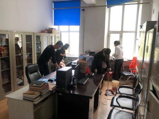 学院高度重视并严格落实教职工的安全防护工作,学院办公室为教工、党员志愿者准备好清扫、消毒工具及防护用品。此次卫生消杀工作中,学院教职工对各自所负责区域进行全面清扫、消毒,公共区域由教工党员志愿者负责。他们干劲十足、工作有序,分批次、分区域对学院进行卫生消杀工作,做到了卫生消毒全覆盖。