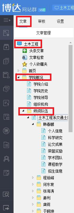3、在文章----土木工程------永利官网-------师资队伍下找到自己相应的教研室以及自己的名字点击左侧的向下三角箭头,进入相应栏目进行编辑。